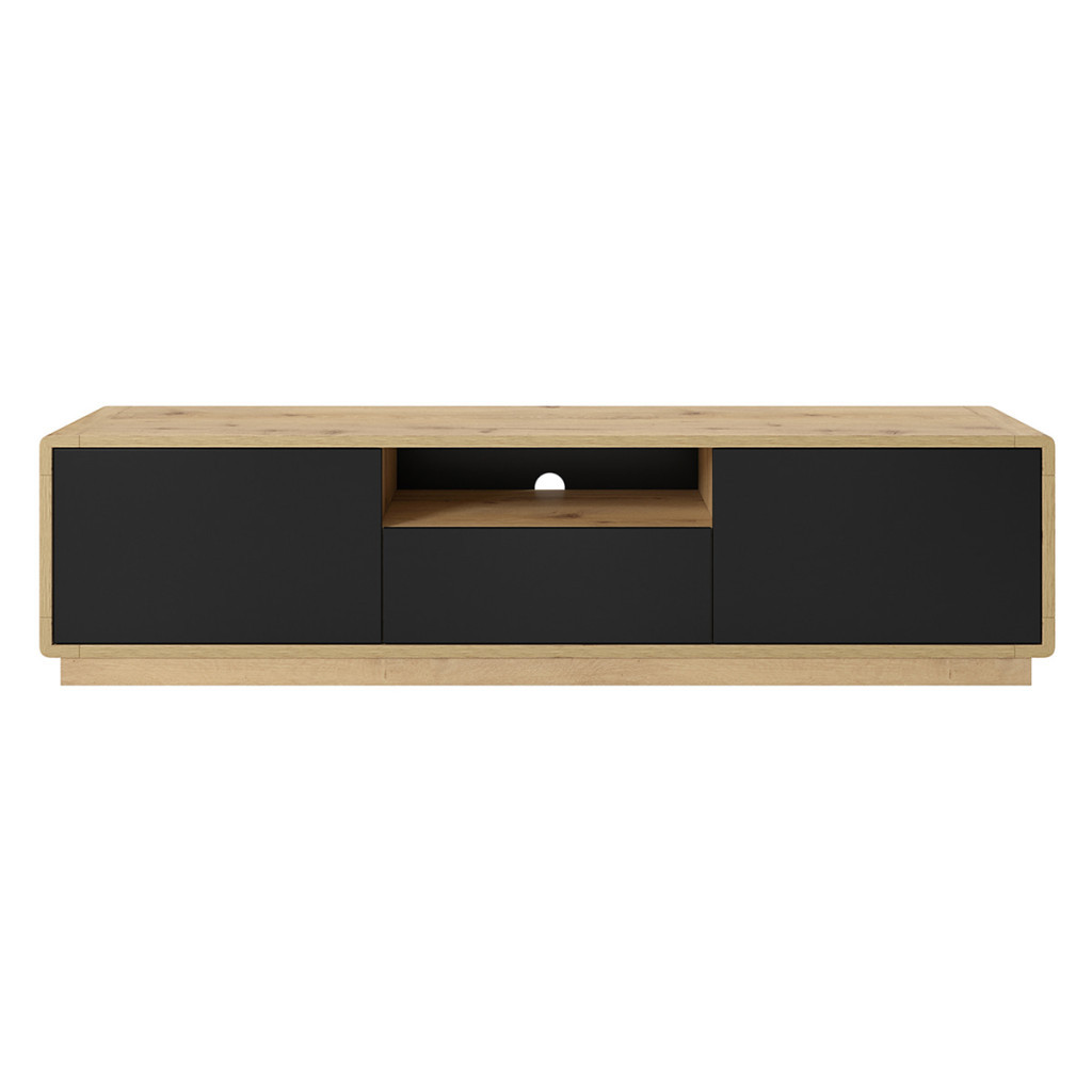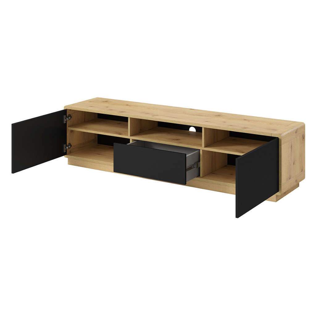A Tv állvány két nyíló ajtaja mögött polcokat talál, míg a középső fiókban apróságokat tud rendszerezni. A nyitott polcon pedig helyet kaphat a szórakoztató elektronika.