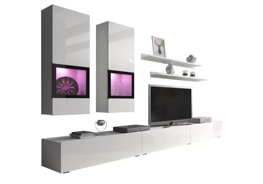 A BAROS nappalibútor-összeállítás modern formavilágával és fényes fehér előlapjainak köszönhetően garantáltan jó választás lesz nappalijába. Bútorlapból készül, részben üvegezett ajtókkal. A két fali szekrényben 2-2 polc található, az alsó szekrényben 3 ajtó mögött 2-2 fakkos tároló, valamint további két falipolc biztosítja a bőséges tárolókapacitást, így nem csak dizájnos, de praktikus megoldást is nyújt.