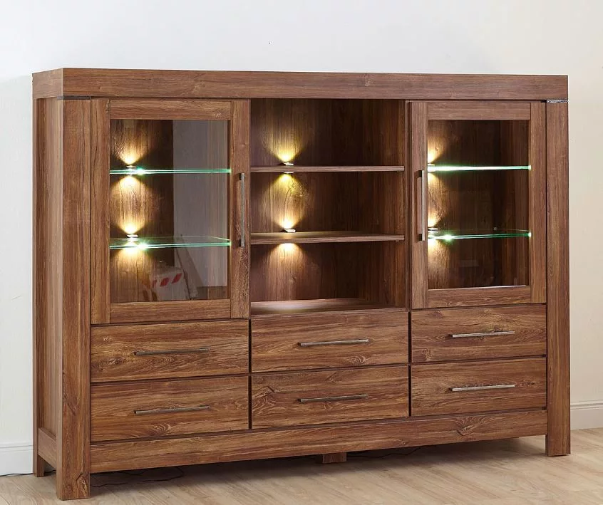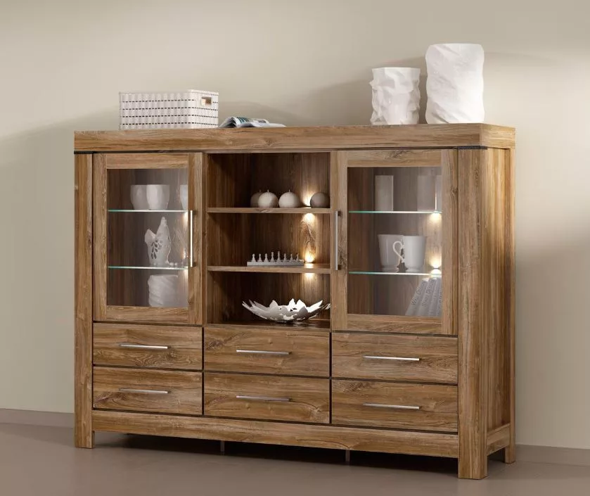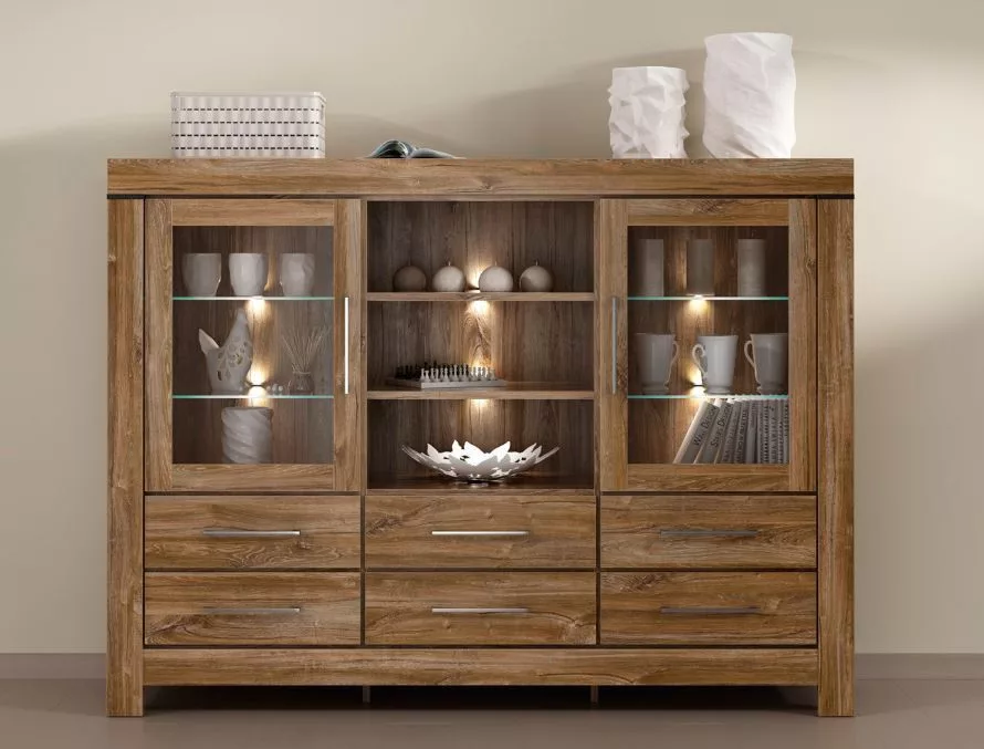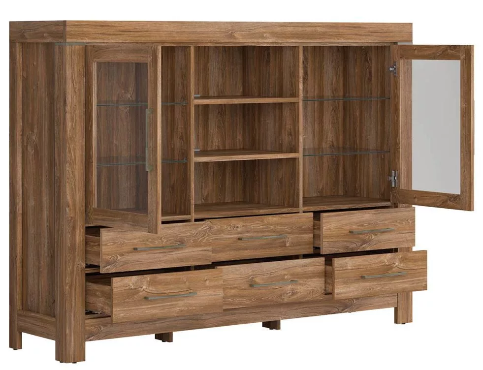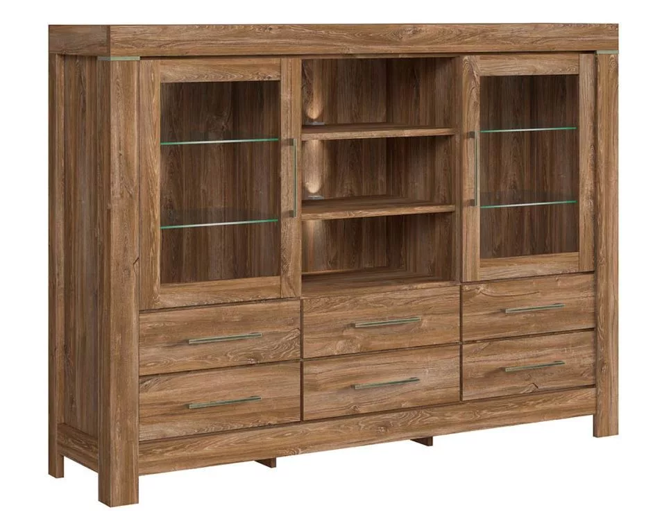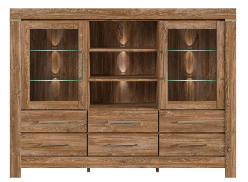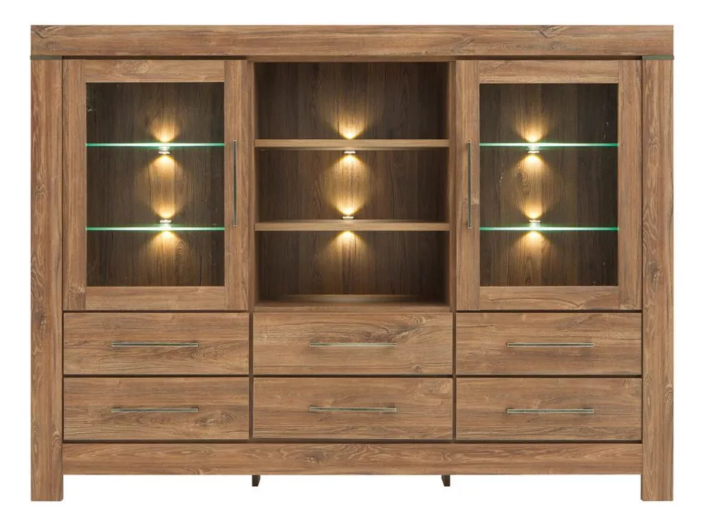 Ez a tökéletes kialakítású komód, két vitrines ajtajával és hat praktikus fiókjával kellő helyet garantál dekorációs tárgyainak és a fiókokban akár iratokat is tárolhat. A polcok alatt elhelyezett energiatakarékos LED világítás kiváló alapot ad a dekoráció megvilágításához. Acél színű fogantyúk és edzet üvegből készült vitrines ajtóknak köszönheti innovatív megjelenését. Hangtalan záródás jellemző.