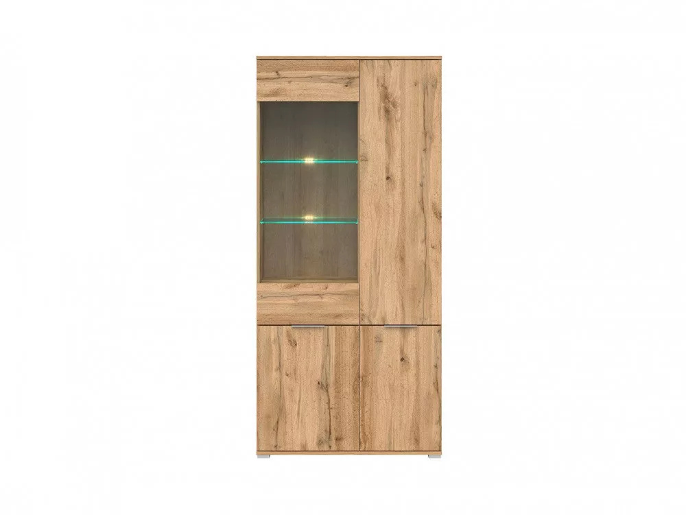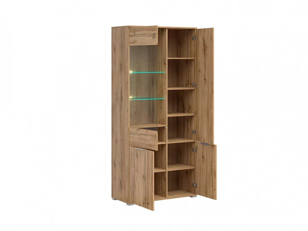 A széles, magasvitrin rengeteg tárolóhelyet kínál. Négy ajataja mögött összesen 10 polc található, melyből két edzett üveg polc, melyekhez LED-világítás rendelhető külön.