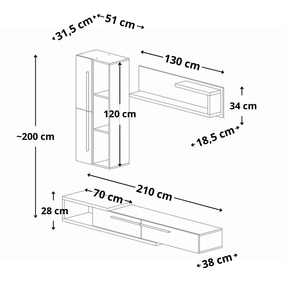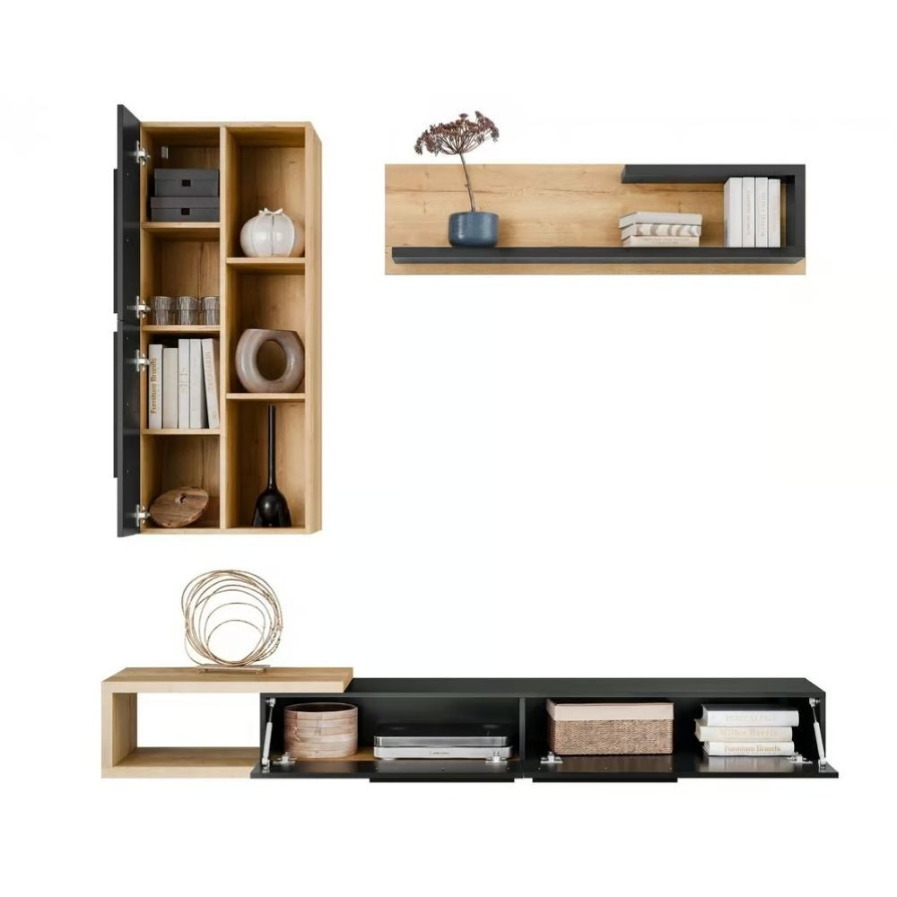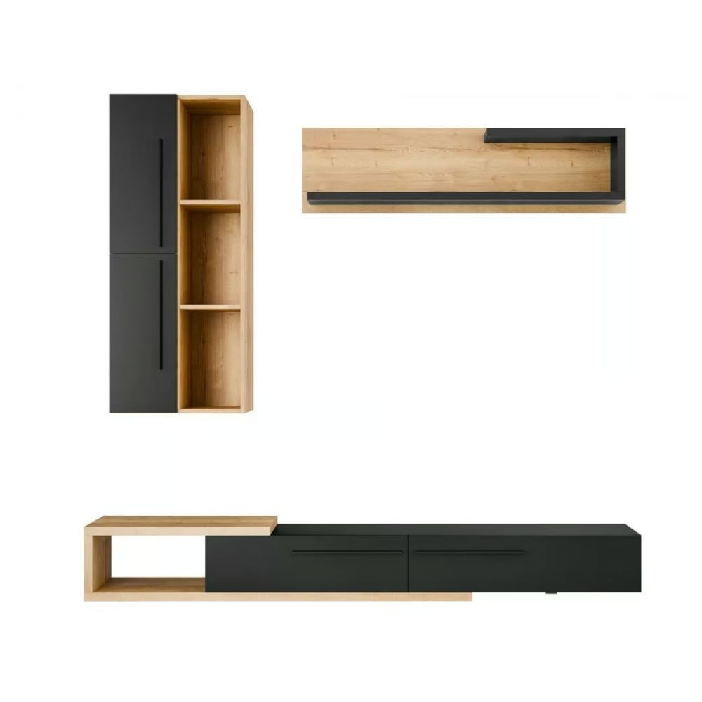A fali szekrény 3 nyitott polccal és két ajtóval van ellátva. Ezt egészíti ki a Tv állvány 1 nyitott résszel és 2 db lefelé nyíló ajtóval. A szett tartalma továbbá 1 db polc.