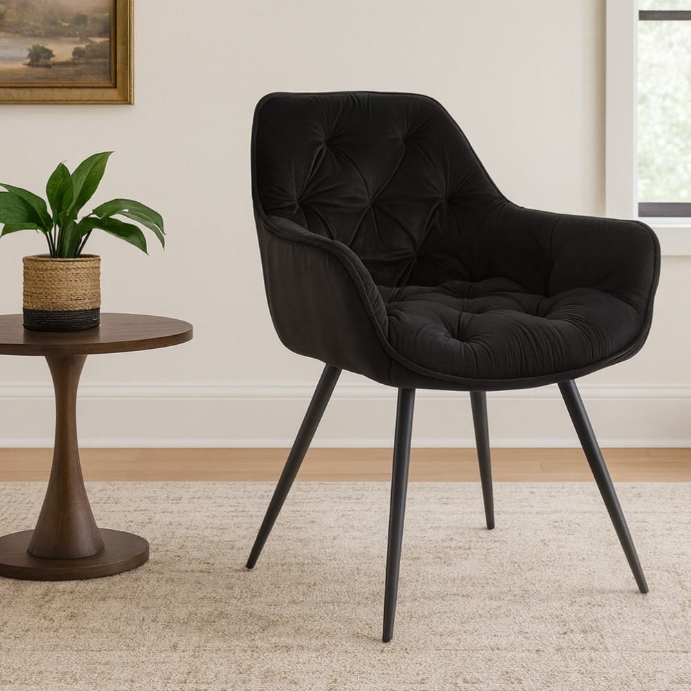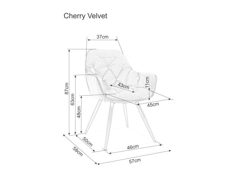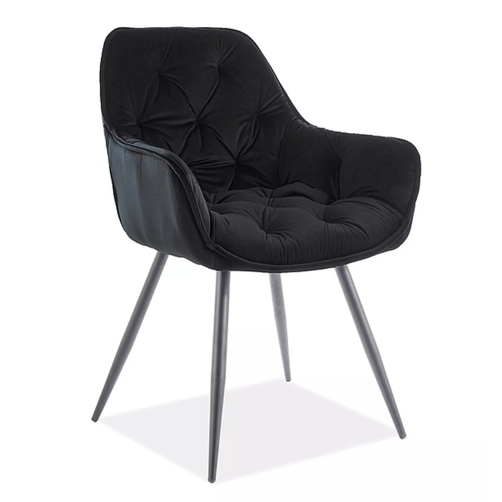 Bársonyos étkezőszék nagy színválasztékban. Stílusos dekorvarrással a háttámla belső felében. Stabil, mégis karcsú, fekete fémlábakon áll.