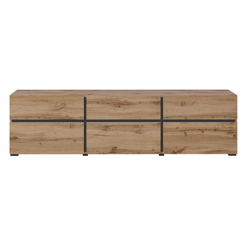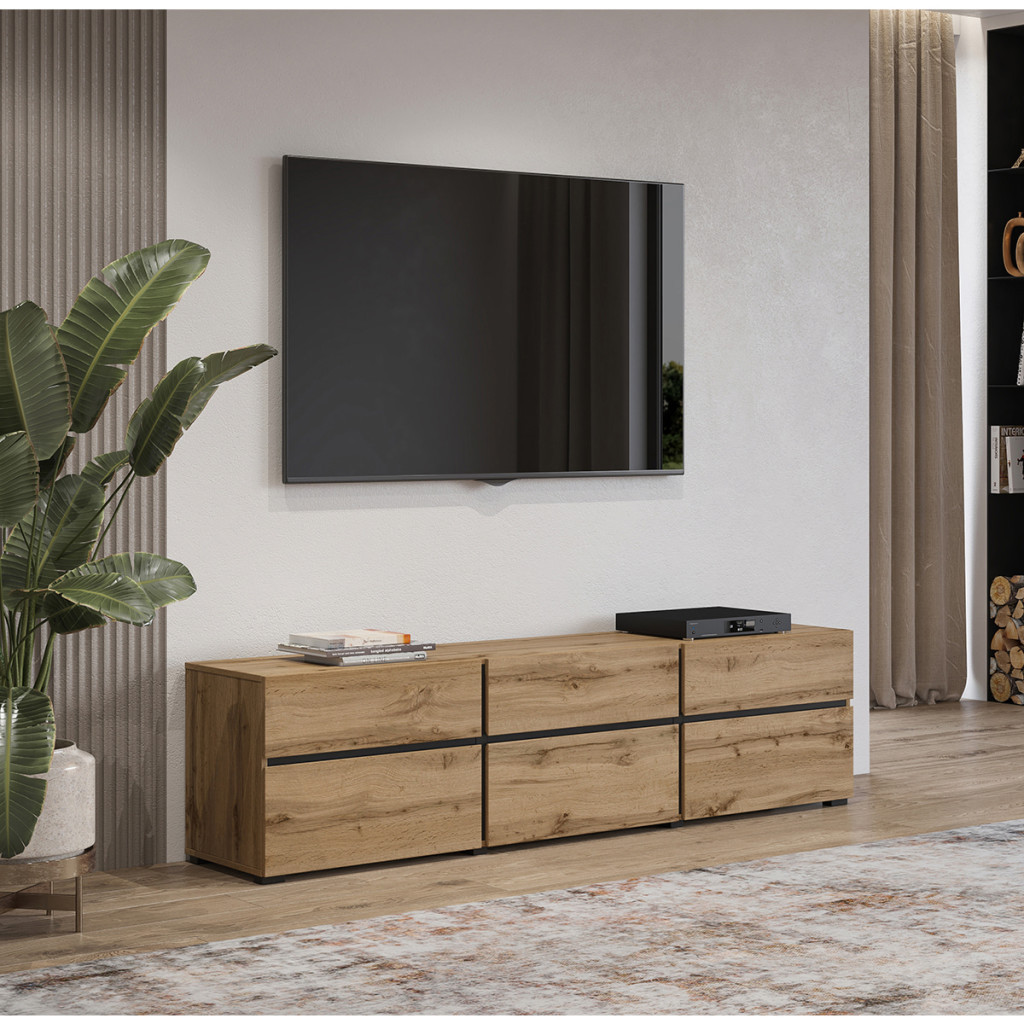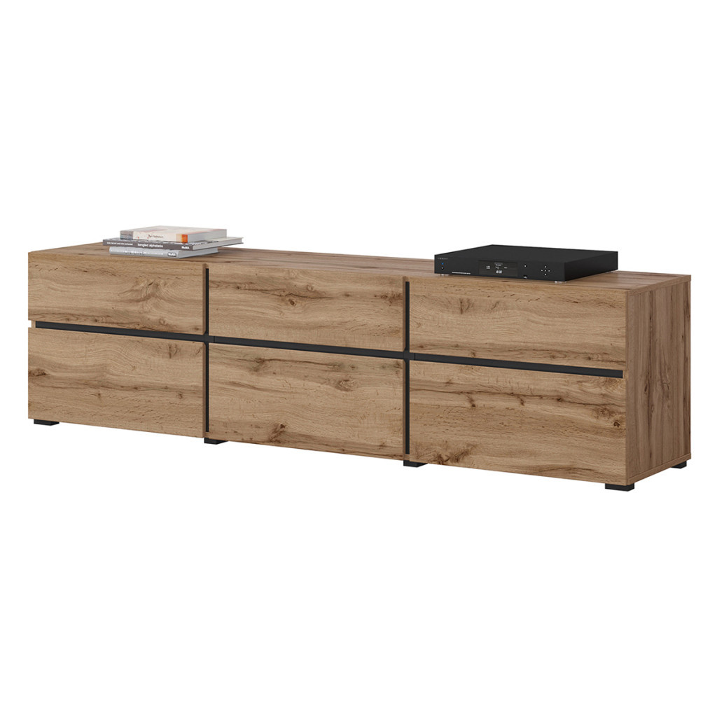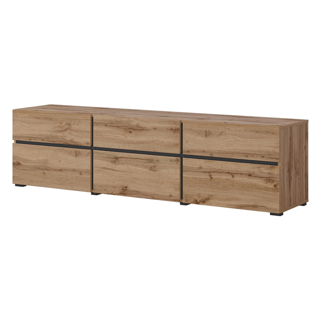 A képen látható bútorcsalád modern megjelenésével és letisztult vonalvezetésével tökéletes választás a stílusos nappalikba. A természetes faerezetű frontok elegáns fekete osztásvonalakkal párosulnak, melyek dinamikus kontrasztot és karakteres megjelenést kölcsönöznek a bútoroknak.