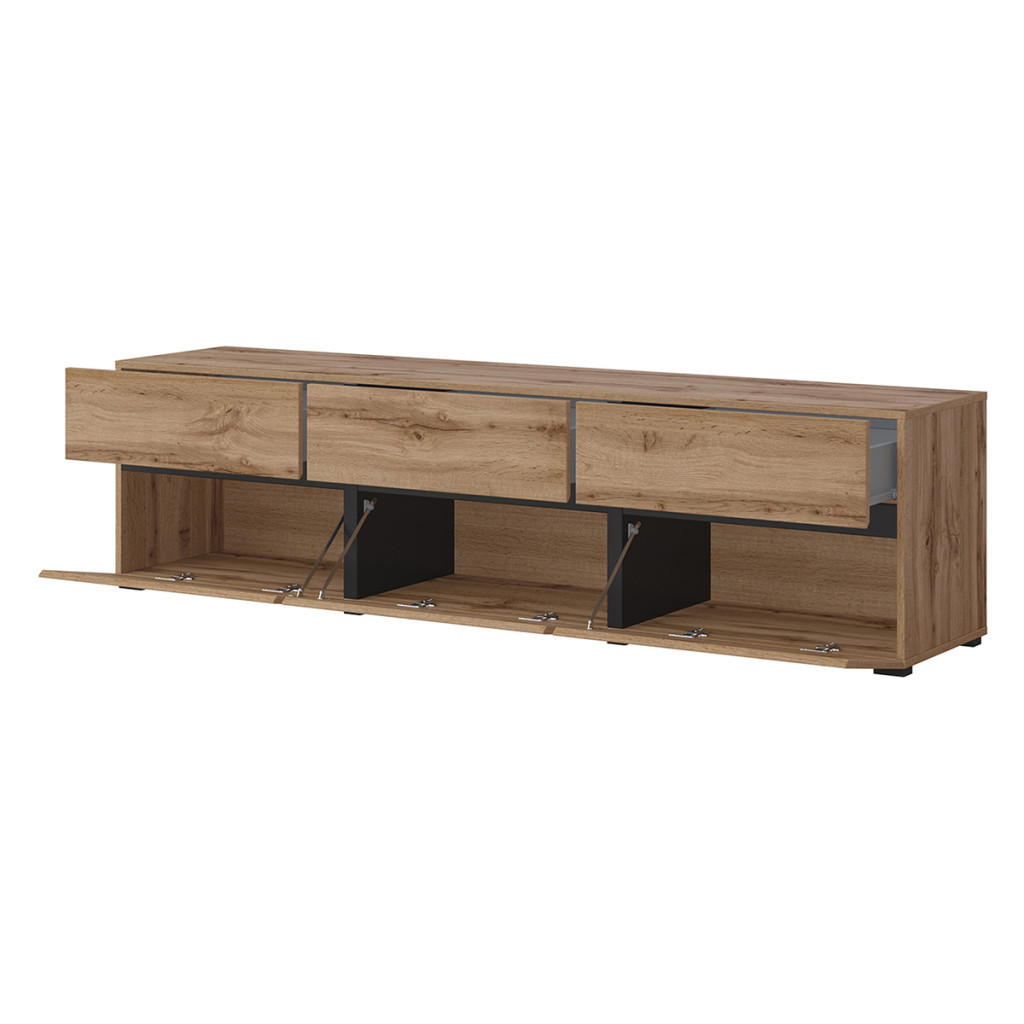 Ez a három lenyíló ajtós, három fiókos TV állvány a nappalija központi elemévé válhat. Praktikus, látható fogantyú nélküli kivitel, mely abszolút beleolvad környezetébe.