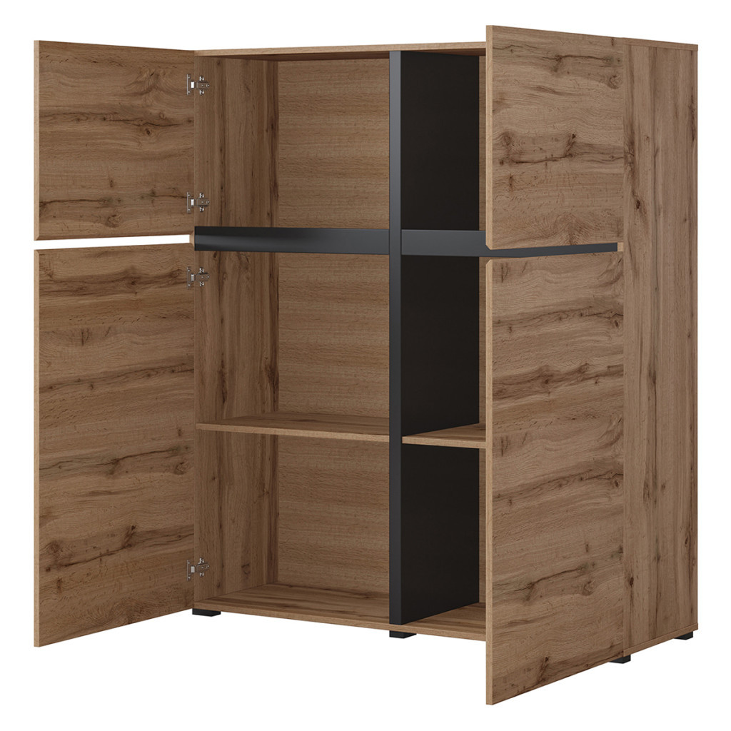 A képen látható bútorcsalád modern megjelenésével és letisztult vonalvezetésével tökéletes választás a stílusos nappalikba. A természetes faerezetű frontok elegáns fekete osztásvonalakkal párosulnak, melyek dinamikus kontrasztot és karakteres megjelenést kölcsönöznek a bútoroknak.