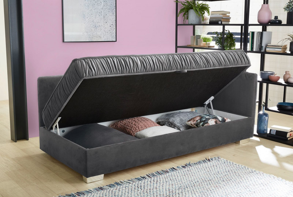 Kiválló kárpitozással rendelkező heverő, ami akár mindennapi alvásra is alkalmas. A hullámrugós ülőfelület biztosítja a tökéletes kényelmet. A beépített ágyneműtartó elegendő helyet biztosít és nagyon egyszerűen nyitható, a rugós mechanikájának köszönhetően. Az árba a három párna is beletartozik.