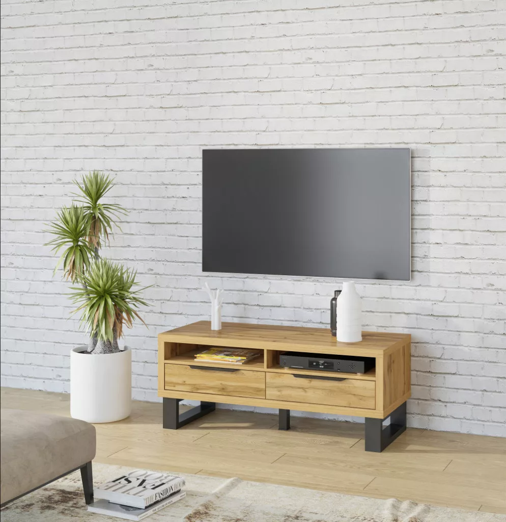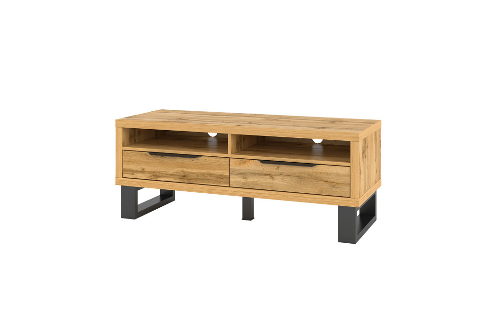 A széles TV-állvány 2 lenyíló ajtós tárolórésszel és egy nyitott, polcos résszel rendelkezik, melynek hátulján kábelvezető nyílás kapott helyet, ami megkönnyíti elektronikai eszközei kábelelvezetését.