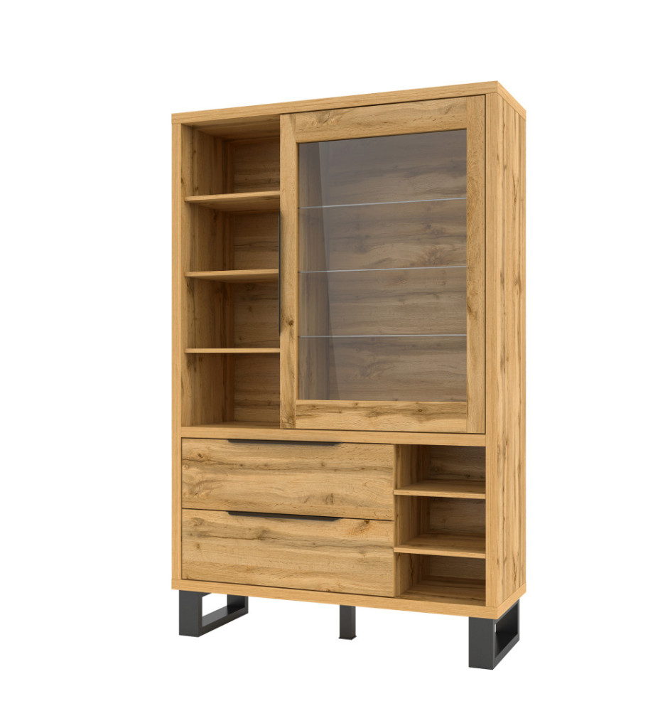 A vitrin ajtaja mögött 3 üvegpolc, bal alul pedig 2 fiók található, emellett összesen 5 különböző méretű nyitott polc kapott helyet, így bőséges tárolóhellyel rendelkezik.