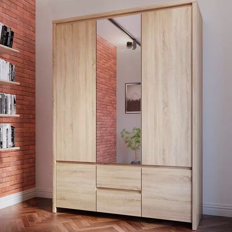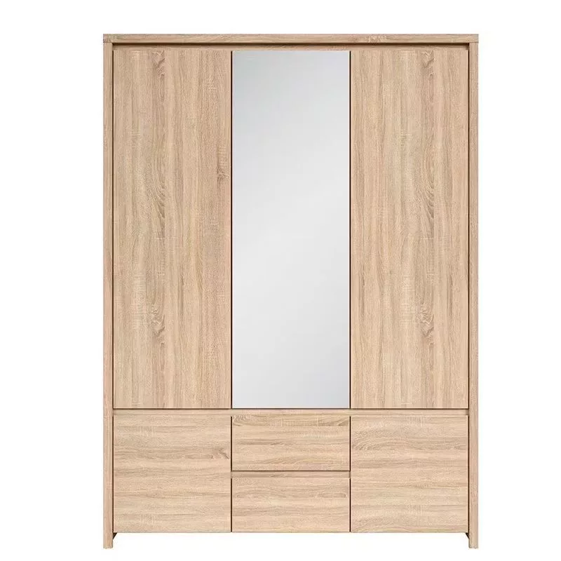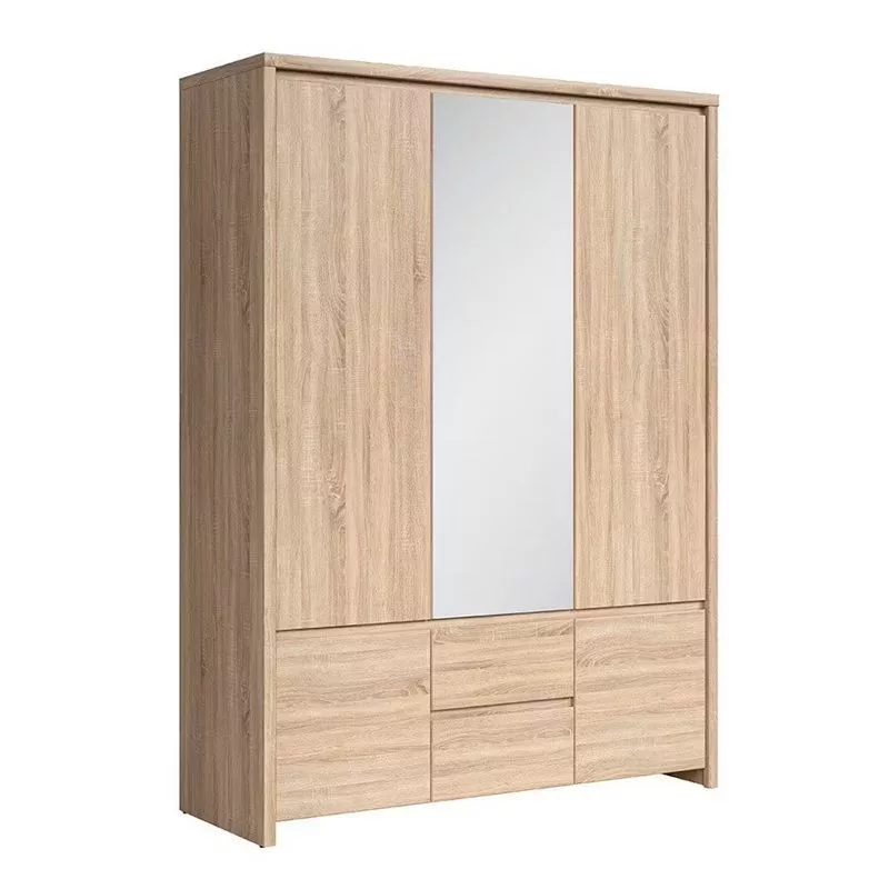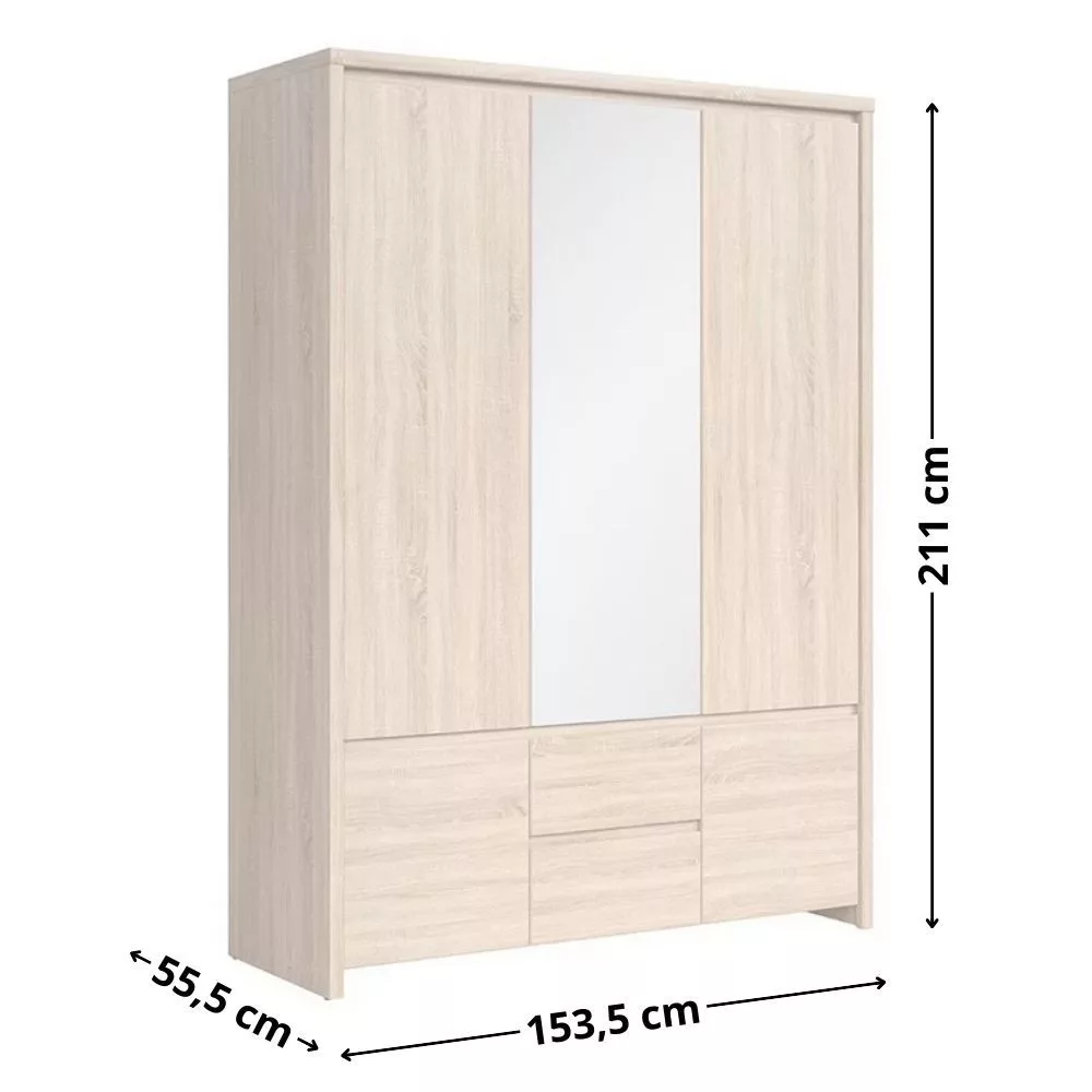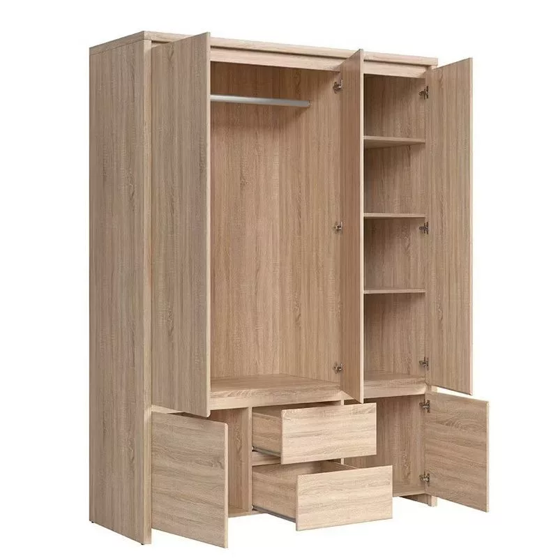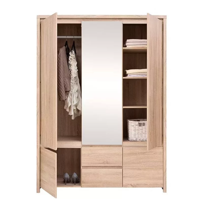 Ötajtós, kétfiókos ruhásszekrény, jobb oldalt 3 polccal. Letisztult formavilágával, szögletes vonalaival, fogantyú nélküli designjával nagyszerű választás bárki számára. A bútorcsalád elemeivel könnyen berendezheted nappalid, hálószobád, irodád vagy gyermeked szobáját.