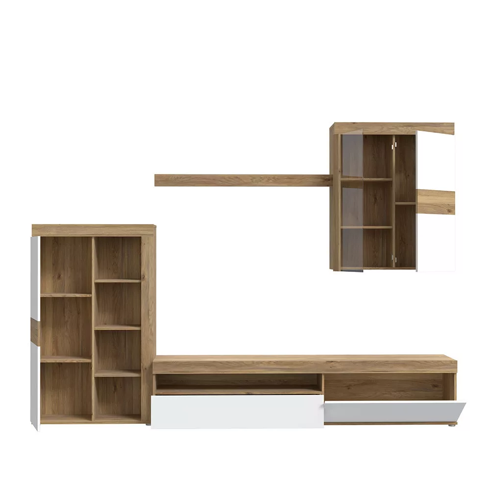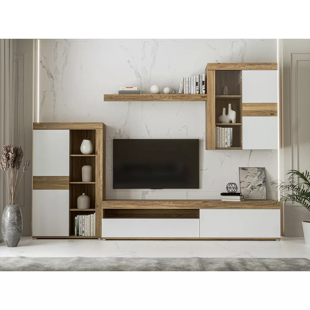 A falra szerelhető elemek légiesebbé teszik a szettet, a masszív alsó egység pedig biztos alapot ad a televíziónak és egyéb elektronikai eszközöknek.