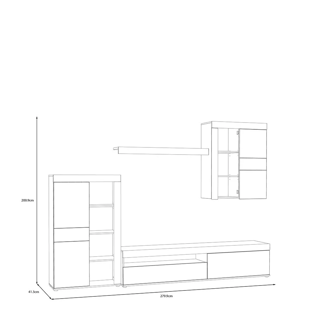 Fedezd fel a nappali berendezés új szintjét ezzel a letisztult, mégis karakteres nappali bútor szettel, mely nemcsak esztétikus, de praktikus is! A 279,9 x 200,9 x 41,3 cm méretű összeállítás tökéletes választás, ha egy modern, jól szervezett és időtálló bútorra vágysz.