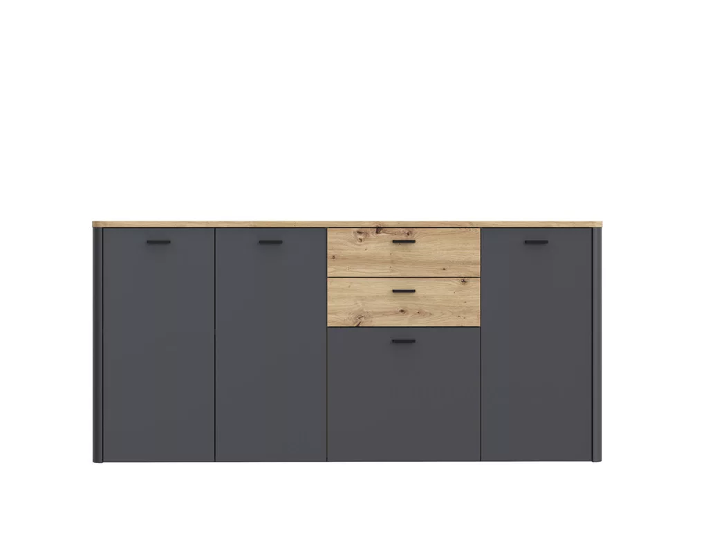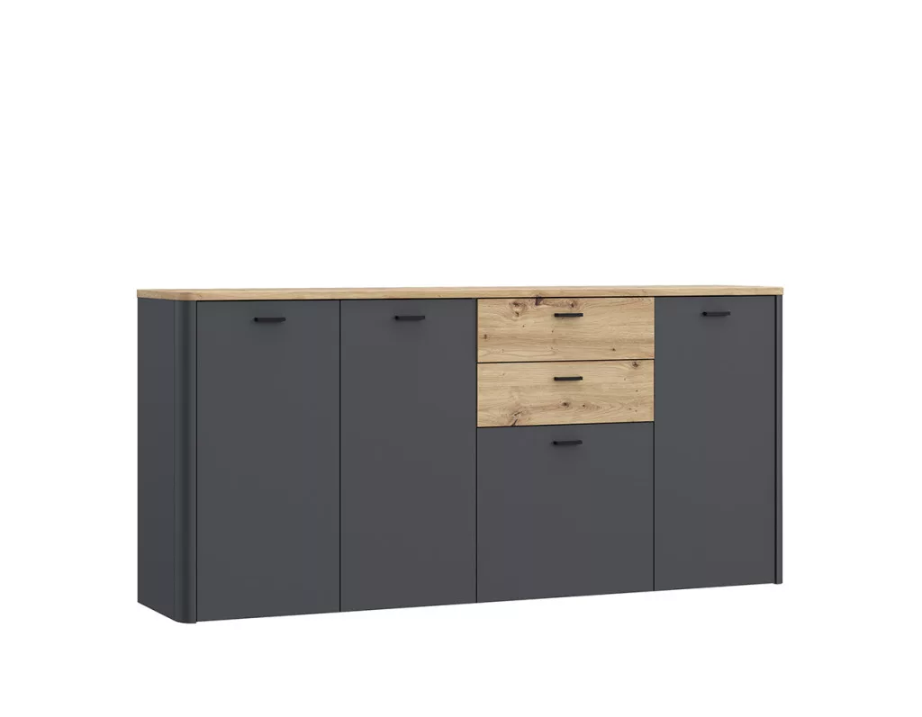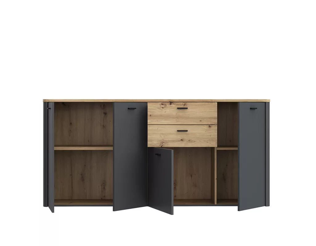 Ez a stílusos komód tökéletes választás nappaliba, előszobába vagy akár hálószobába is. A grafitszürke frontok és a természetes hatású artisan tölgy fiókelőlapok harmonikus kombinációja modern, mégis otthonos hangulatot teremt. Az összesen négy ajtóval és két tágas fiókkal rendelkező bútor rengeteg tárolóhelyet kínál, így könnyedén rendben tarthatod a mindennapi használati tárgyakat. A letisztult formavilág, a fekete fogantyúk és a praktikus kialakítás ideálissá teszik modern enteriőrökbe is.