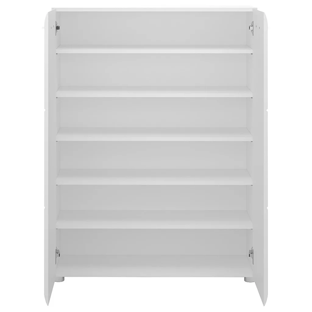 A kétajtós, magas cipős szekrény minőségi, MDF elemekkel laminált forgácslapból készült. A bútorok stílusos, fényes fehér ajtófrontokkal rendelkeznek, dombornyomott mintával. A tágas, magas Meran cipős szekrény kis előszobában is elfér.