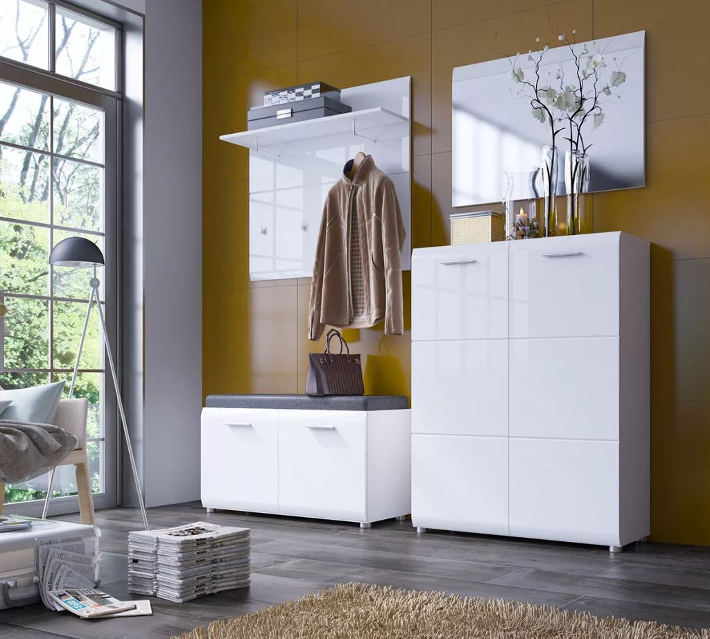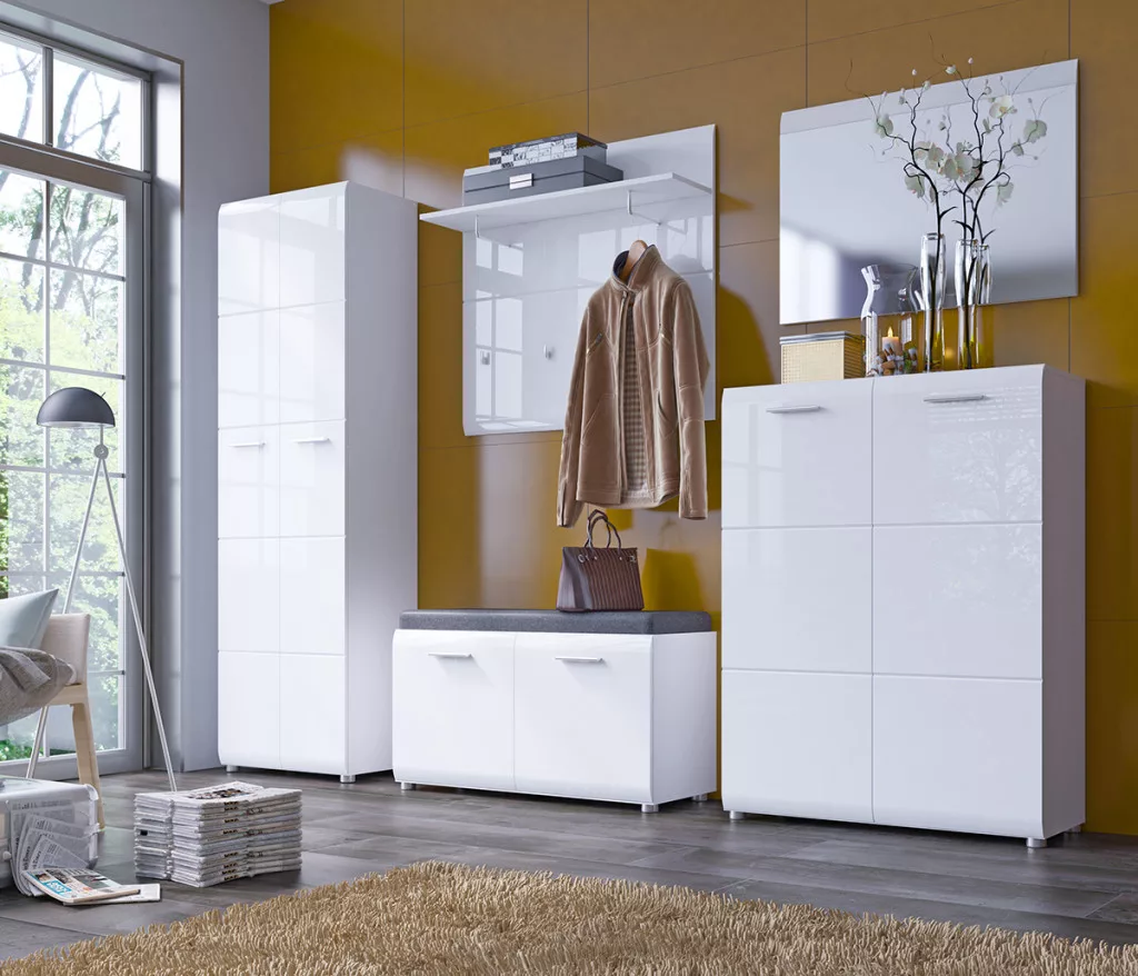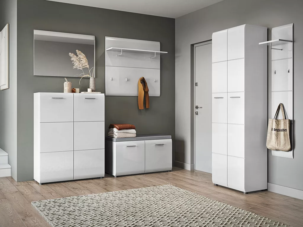 A Meran kollekció esztétikus, modern előszobabútor, időtlen és univerzális fehér színekben. Kiváló dizájnjukkal és rendkívüli funkcionalitásukkal gyönyörködnek. A cipős szekrény, mint a csarnok felszerelésének elengedhetetlen eleme, hangsúlyozza praktikumát és gondosan megtervezett elrendezését.