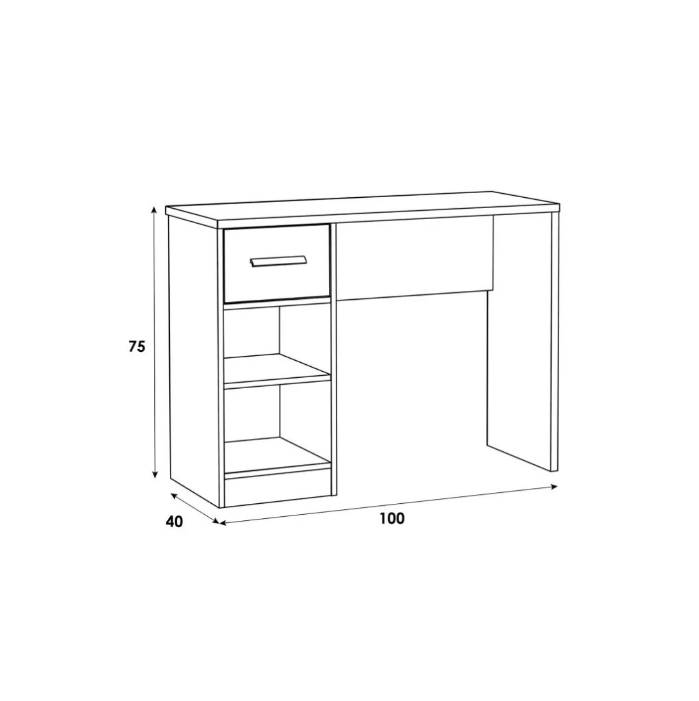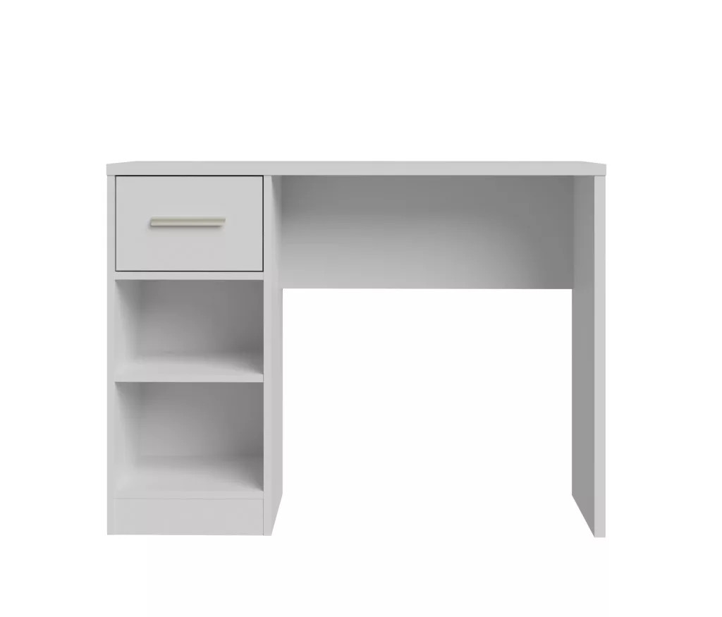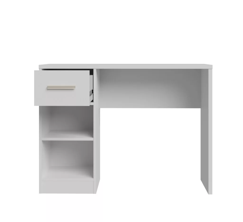 Ez a fehér színű, letisztult formavilágú íróasztal tökéletes választás tanuláshoz vagy otthoni munkához. A bal oldalon elhelyezett praktikus fiókban elrejtheted az apróbb tárgyakat, míg a két nyitott polcon könnyedén rendszerezheted könyveidet, füzeteidet vagy dísztárgyaidat. Kompakt méreteinek és modern kialakításának köszönhetően kiválóan illeszkedik bármelyik szobába.