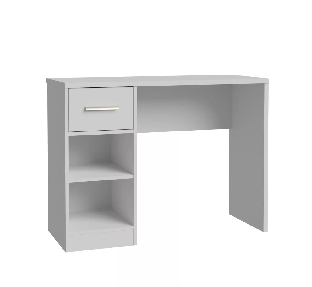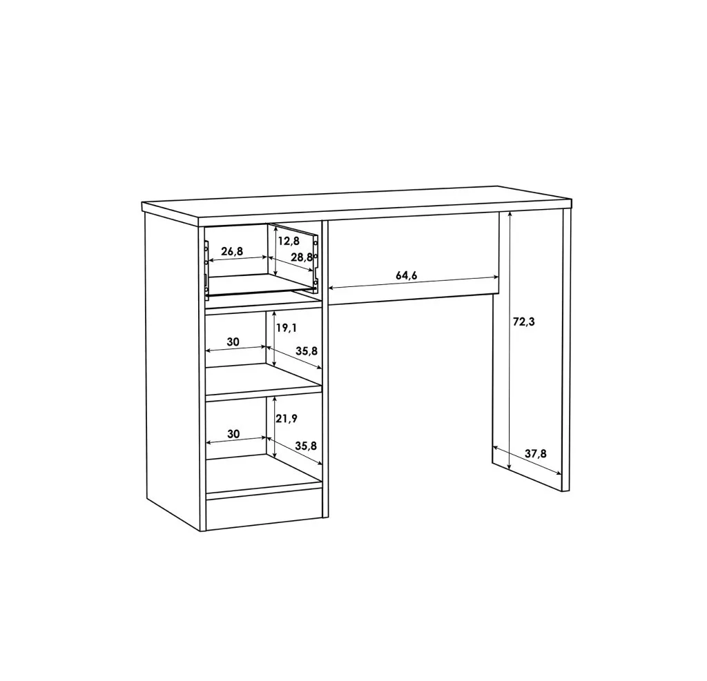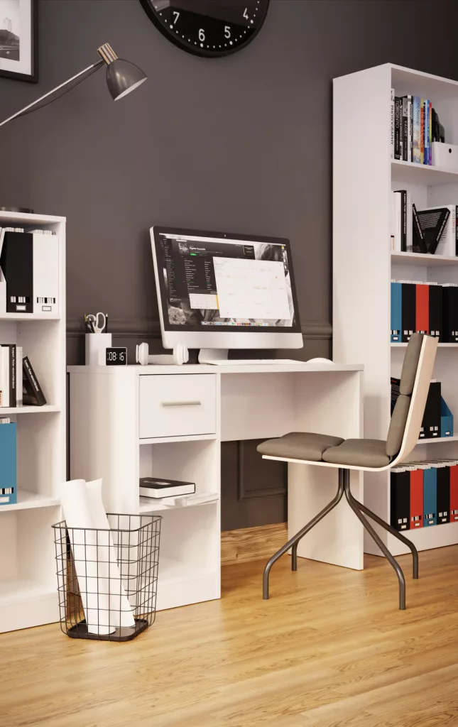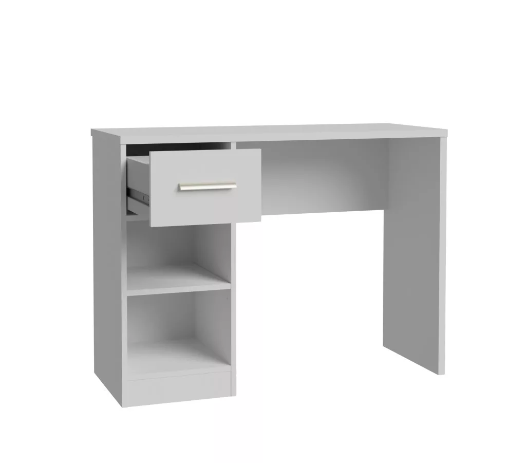 Ez a fehér színű, letisztult formavilágú íróasztal tökéletes választás tanuláshoz vagy otthoni munkához. A bal oldalon elhelyezett praktikus fiókban elrejtheted az apróbb tárgyakat, míg a két nyitott polcon könnyedén rendszerezheted könyveidet, füzeteidet vagy dísztárgyaidat. Kompakt méreteinek és modern kialakításának köszönhetően kiválóan illeszkedik bármelyik szobába.