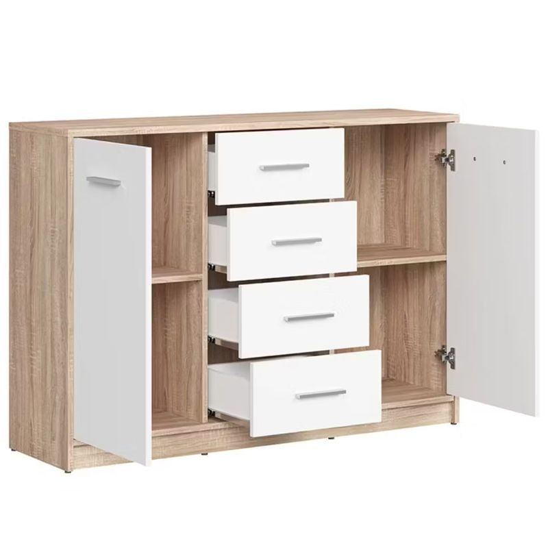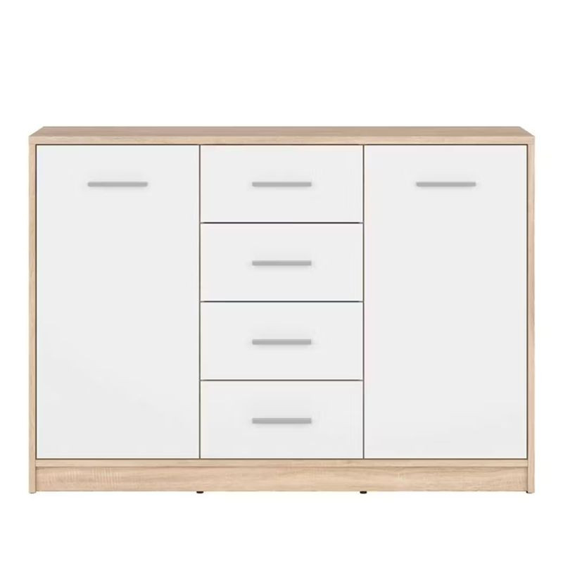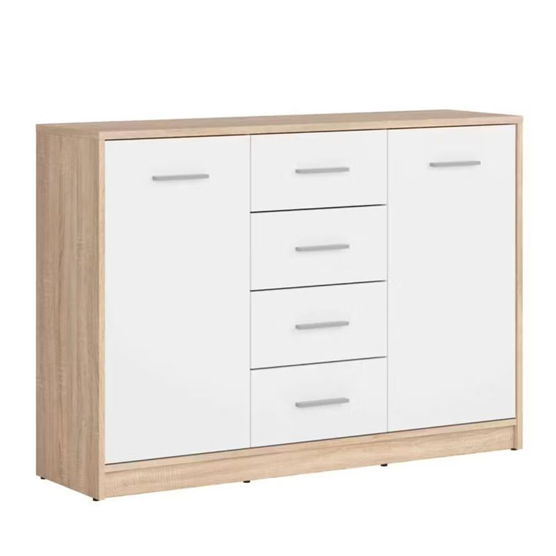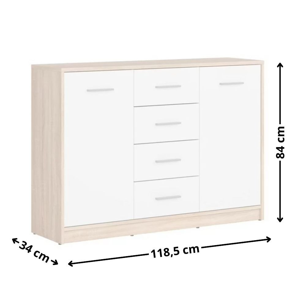 Tökéletes rendszerezést biztosít a négy fióknak és két nyíló ajtónak köszönhetően. Többféle színkombinációban is rendelhető. A vízszintes fogantyúk megkönnyítik a használatot. A komód kiegészíthető a bútorcsalád további elemeivel.