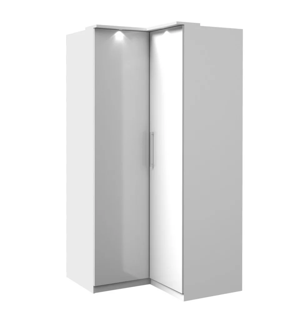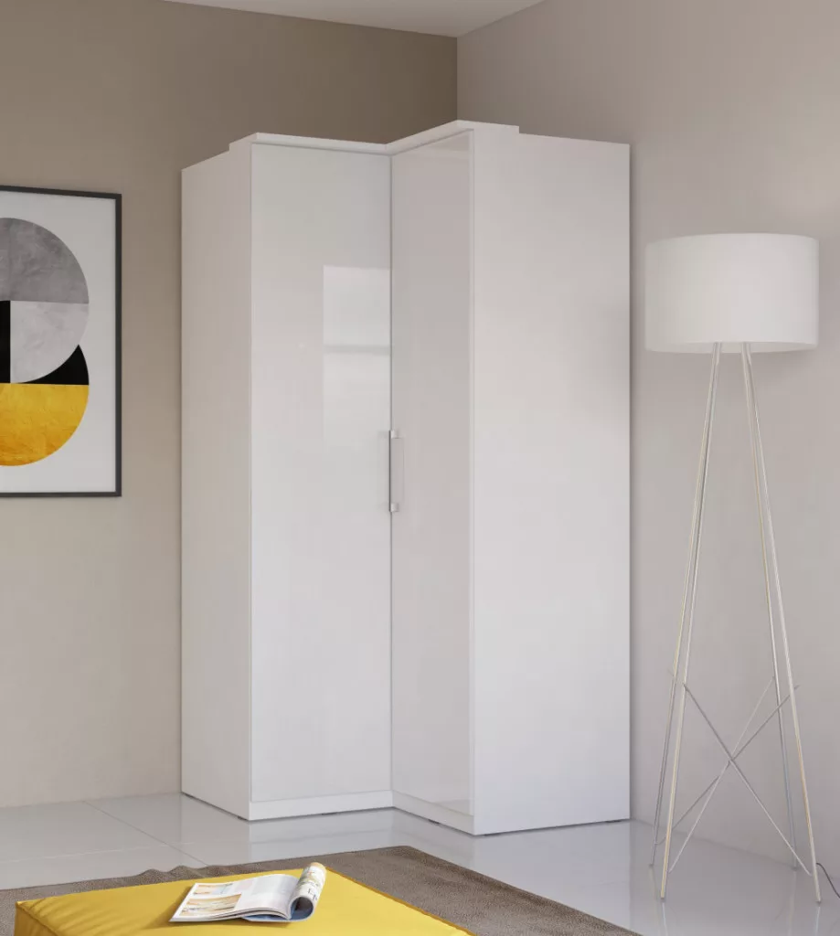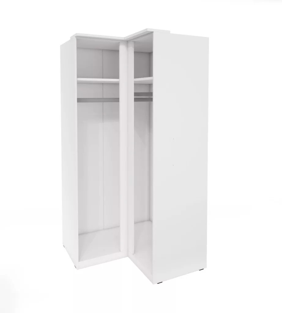 A sarokszekrény két ajtaja mögött egy-egy felső polc, valamint egy-egy vállfatartó rúd található.