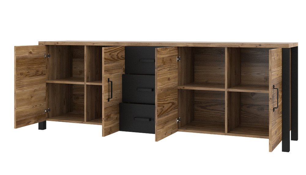 A modern stílus találkozása a természet színeivel. Ez jellemző az Olin komódra is. Ezt a könnyed formavilágot egészíti ki négy nyíló ajtós szekrény kombinálva három fiókkal. A fogantyúk formája teljes mértékben beleillik abba az indusztriális összképbe, melyet ez a bútorcsalád képvisel.