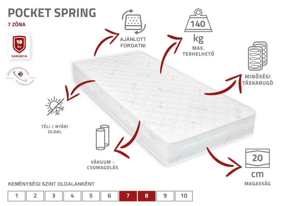A Pocket Spring, téli-nyári oldalas, táska-, vagy más néven zsákrugós matrac a félkemény, de rugalmas ágybetétek közé tartozik és nem áthullámzó, mint a régi bonell-rugós matracok. Kiváló formakövetése miatt minden alváspozícióban kényelmes és pihentető éjszakákat biztosít. Optimálisan támasztja alá a testet és meggátolja a nyomáspontok kialakulását, tehermentesítve ezzel a gerincoszlopot és az izmokat. A négyzetméterenkénti 255 db, különböző vastagságú acél zsákrugó 7 ergonómiai zónára osztja a matracot, ennek köszönhetően pontosan illeszkedik a testhez a megfelelő komfortérzet érdekében. Mindkét oldalán 2,5 - 2,5 cm komforthab található. A nagy számú minőségi táskarugó, a nem deformálódó komforthab réteg, illetve a nagy teherbírás révén ez a matrac sok éven keresztül megőrzi a minőségét.