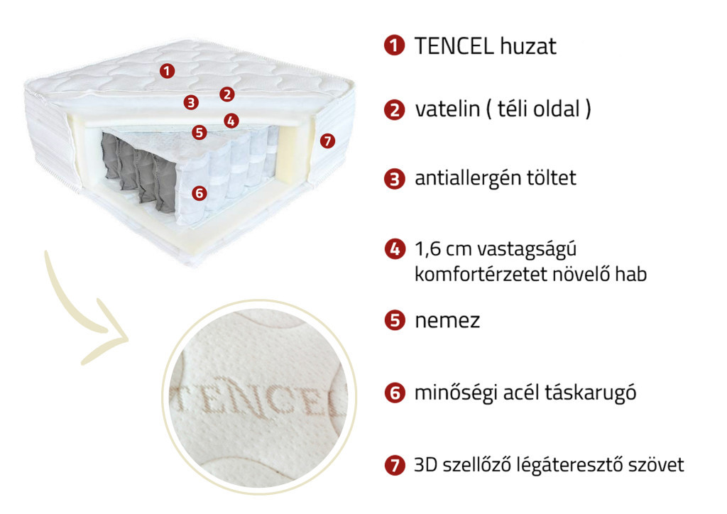 A huzat alatt: TENCEL huzat, vatelin (téli oldal), antiallergén töltet, 2 cm vastagságú komfortérzetet növelő hab, nemez, 255 db/m² különböző vastagságú, minőségi acél táskarugó (1,8 – 2,0), 14 cm magasságú, 3D szellőző légáteresztő szövet