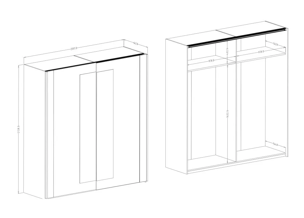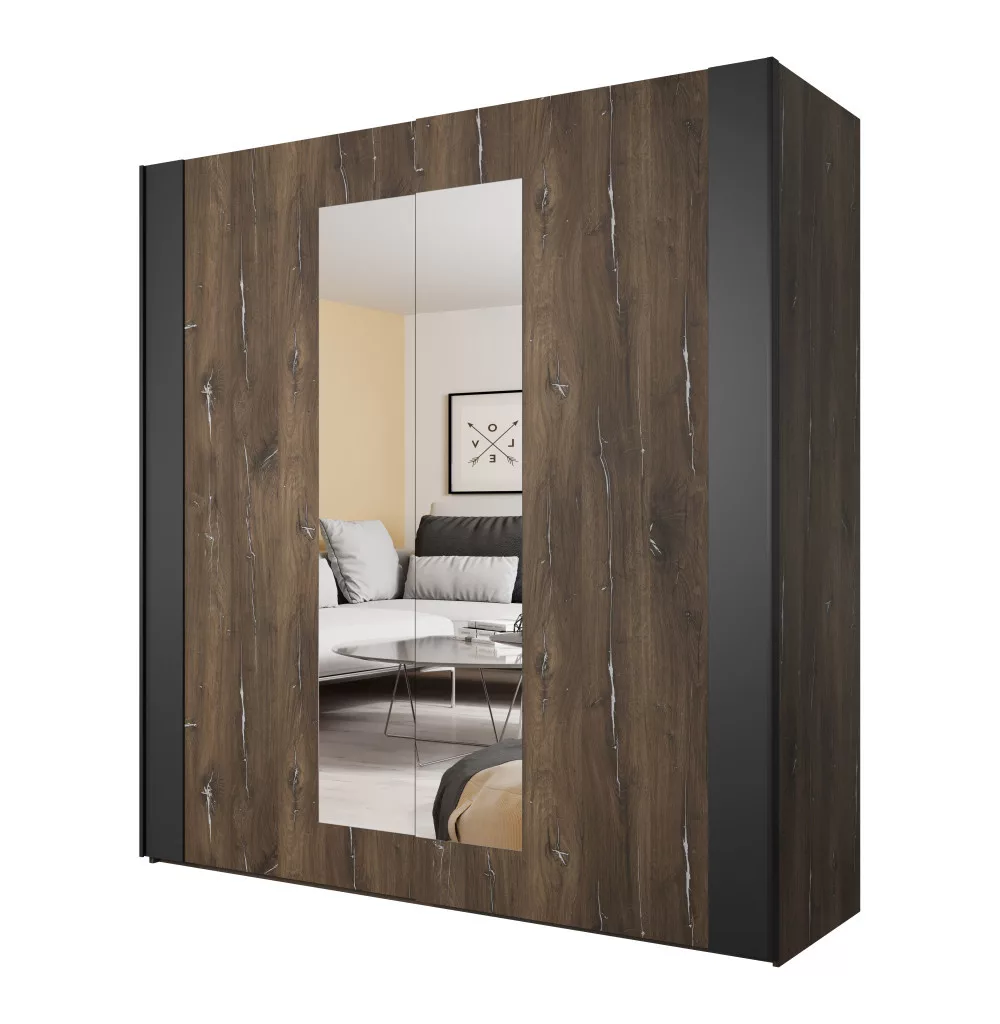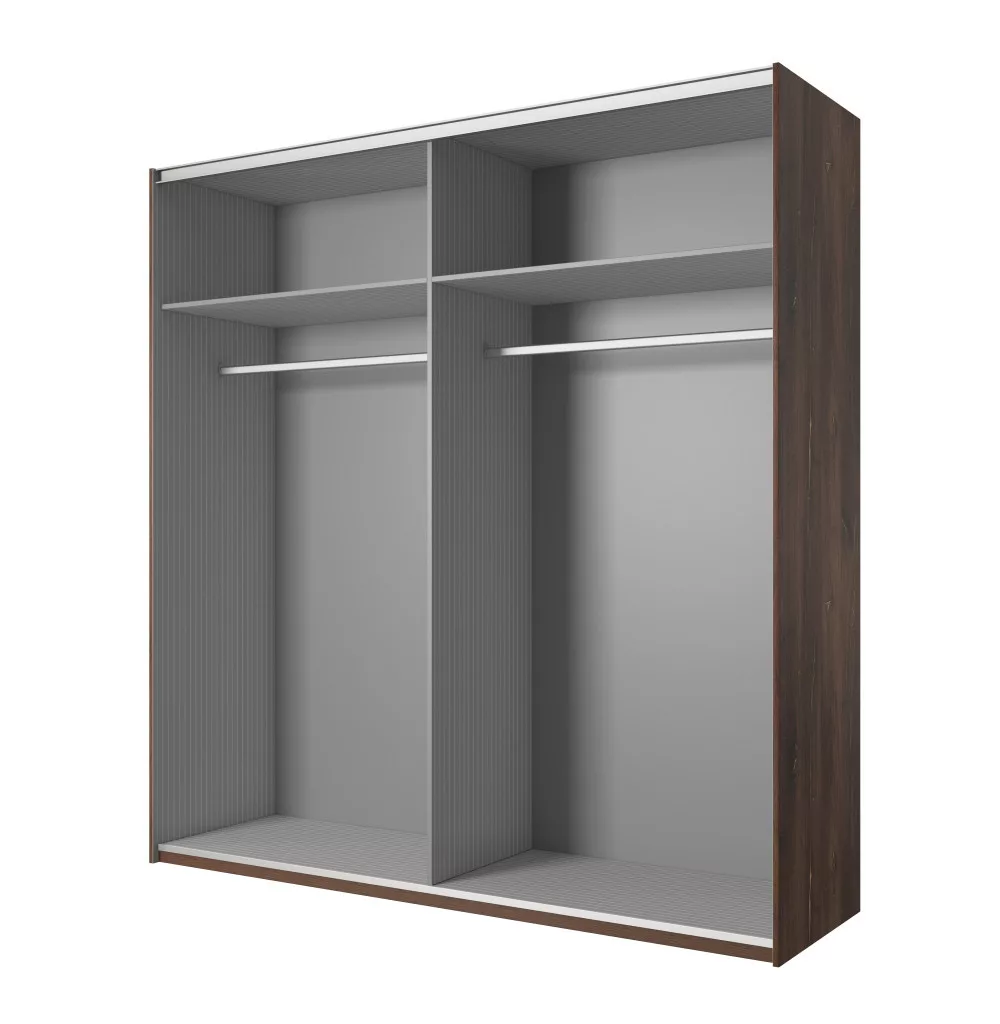 A SIGMA kollekció egyedülálló, naturális és modern elemeket ötvöző, részletgazdag bútorcsalád. A sötét, Flagstaff tölgyhatású, laminált bútorlap különlegessége a megbúvó, ezüstös, antik hatású dekormintázatban rejlik. A két tolóajtó mögött egy-egy felső polc, valamint egy-egy vállfatartó rúd kapott helyet.