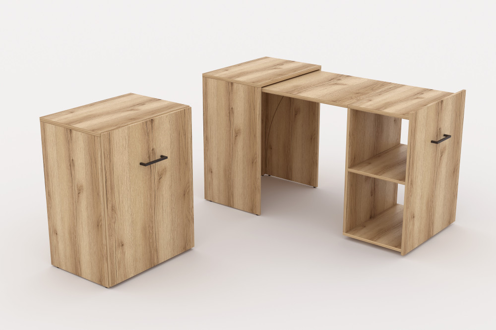 Egy igazán különleges és praktikus bútor. Az íróasztalból könnyedén egy komód alakítható ki, melyben két részes tárolórész is megtalálható. Így, ha nincsen szükségünk az asztalra, helyet szeretnénk felszabadítani, a rajta lévő dolgainkat a tárolórészbe helyezzük és egyszerűen összecsukjuk.