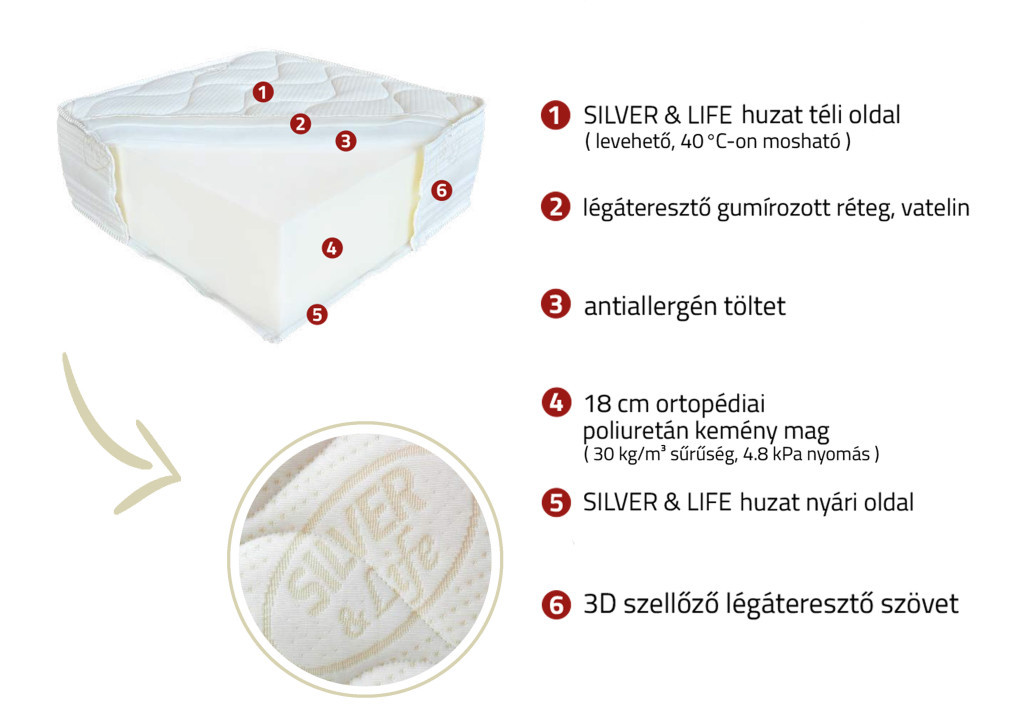 A huzat alatt: SILVER & LIFE huzat téli oldal (levehető, 40 °C-on mosható), légáteresztő gumírozott réteg, vatelin, antiallergén töltet, 18 cm ortopédiai poliuretán kemény mag (30 kg/m3 sűrűség, 4.8 kPa nyomás), SILVER & LIFE huzat nyári oldal, 3D szellőző légáteresztő szövet.