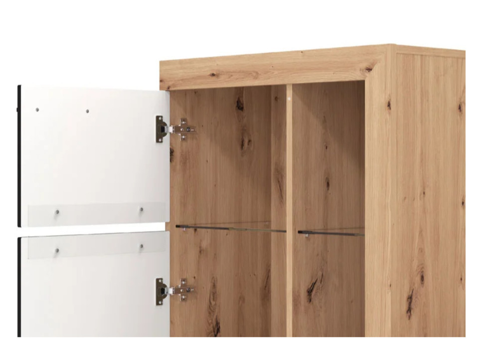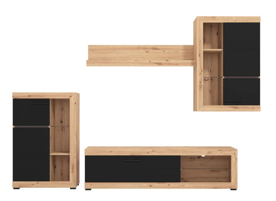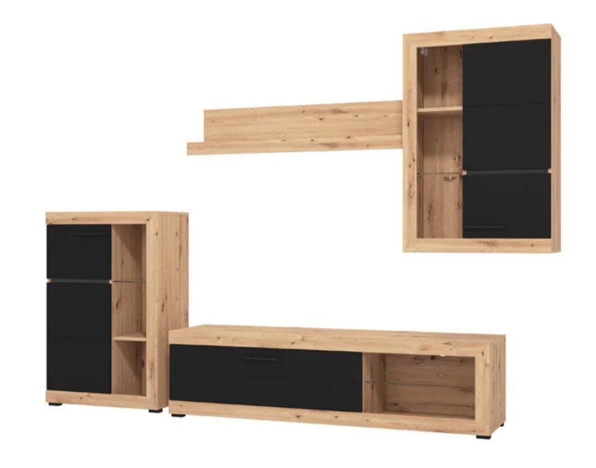 Ez a stílusos nappali szett tökéletes választás, ha letisztult, mégis karakteres enteriőrt szeretnél kialakítani. A természetes fa hatású felületek és a matt fekete elemek kontrasztja modern, időtálló megjelenést biztosít, amely könnyedén illeszkedik különböző lakberendezési stílusokhoz.