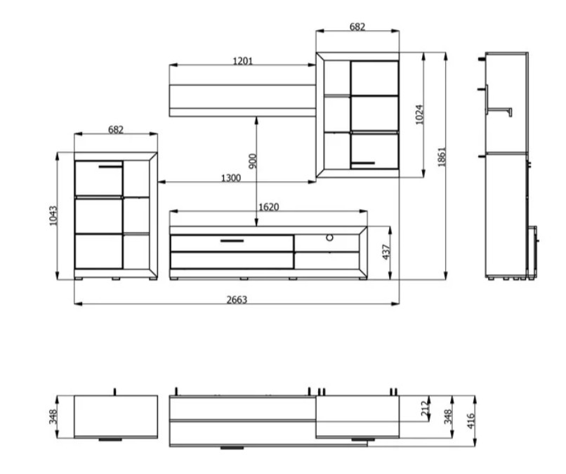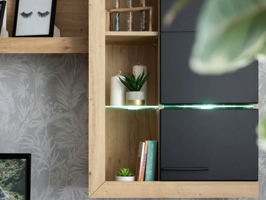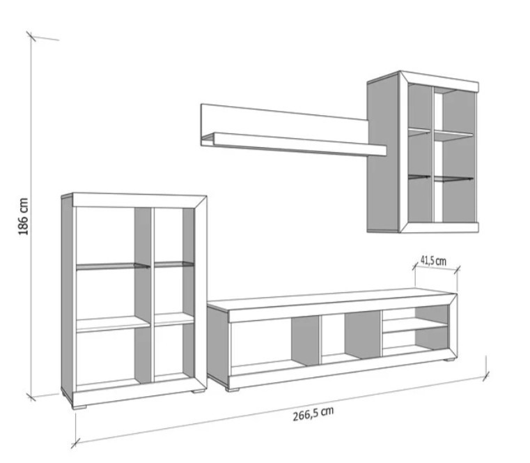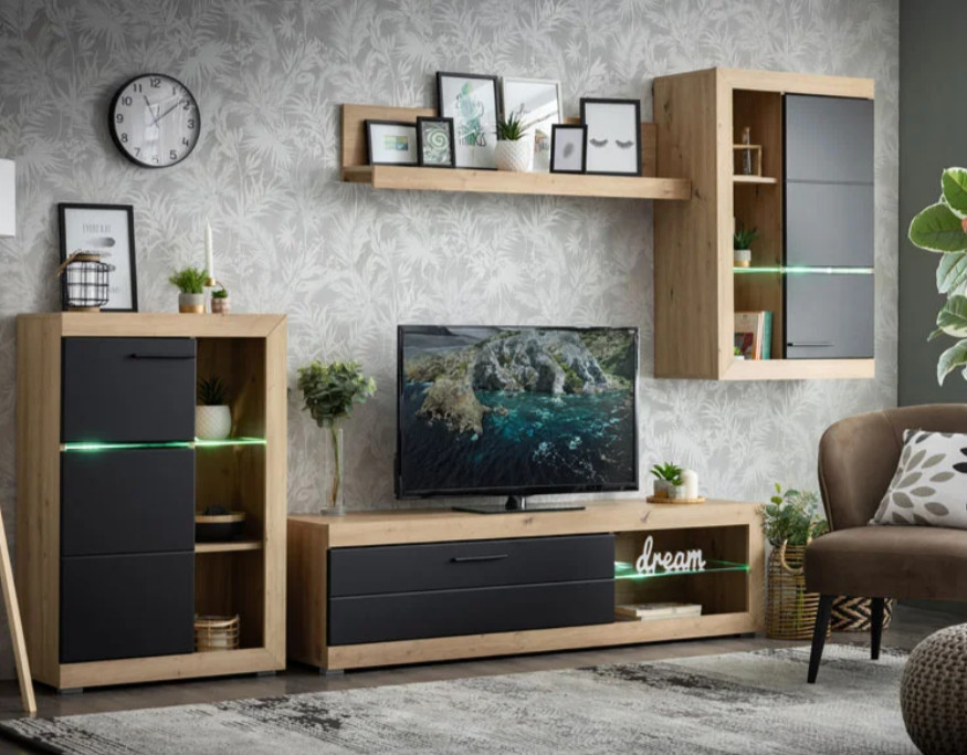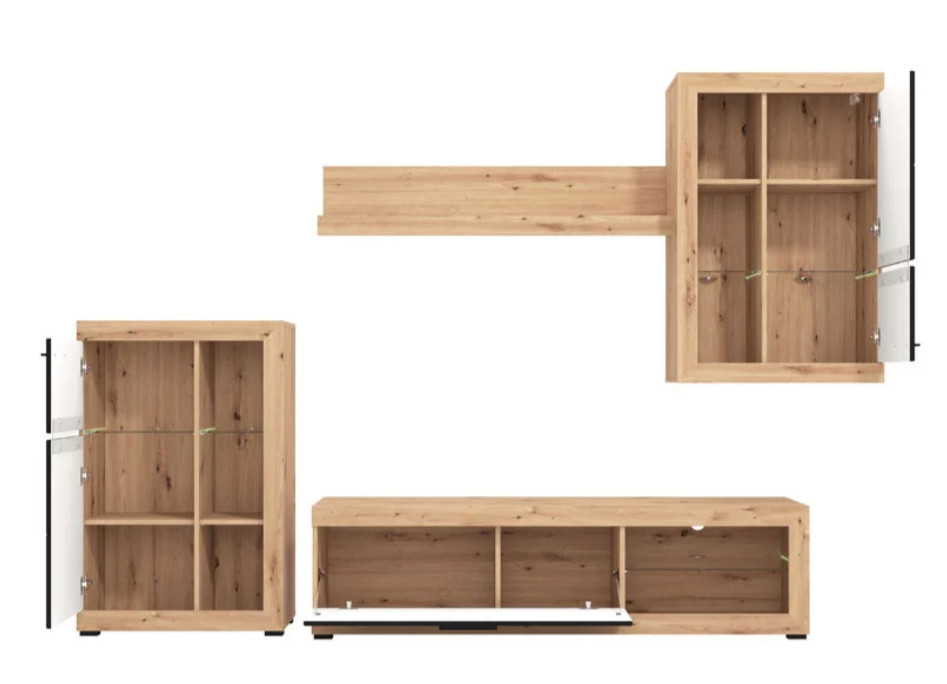A nyitott és zárt tárolók kombinációja lehetővé teszi, hogy a mindennapi használati tárgyakat rendezetten tárold, miközben kedvenc dekorációid is helyet kapnak. A TV-állvány ideális elektronikai eszközök elhelyezésére, míg a fali elemek segítenek kihasználni a rendelkezésre álló teret.