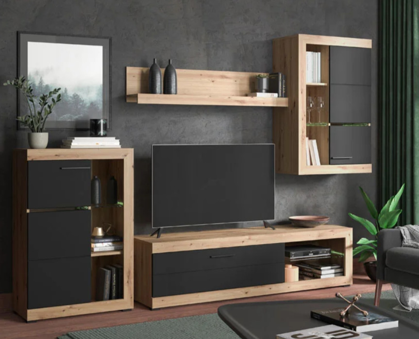 Modern nappali szett – természetes fa és elegáns fekete harmóniája