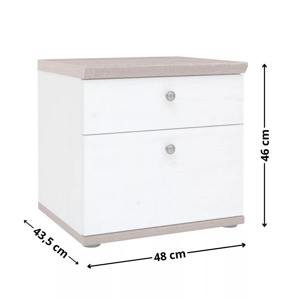 Időtálló formavilágú, kétfiókos éjjeliszekrény, tökéletes kiegészítője a TINA franciaágynak. A gyönyörű canyon fenyő - trüffel tölgy színkombináció, valamint a stílusos, fémfogantyúkkal ellátott ajtók elegáns megjelenést kölcsönöznek, romantikus összhatást adnak az enteriőrnek.