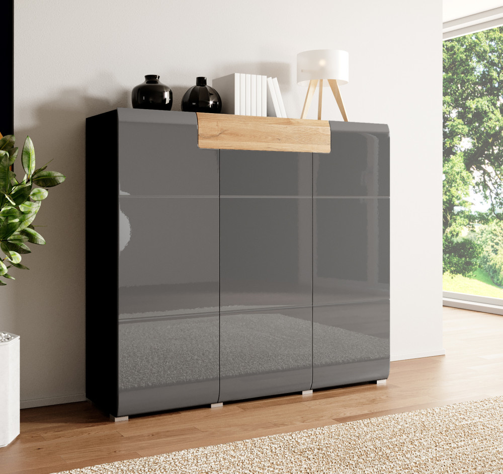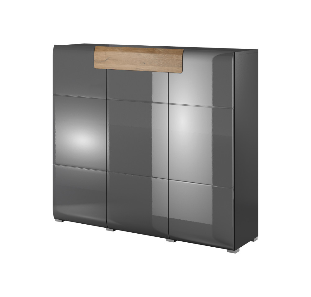 A magas komódban rengeteg tárolóhely kínálkozik; 1 fiók ill. 3 ajtó mögött összesen 8 polc található benne.