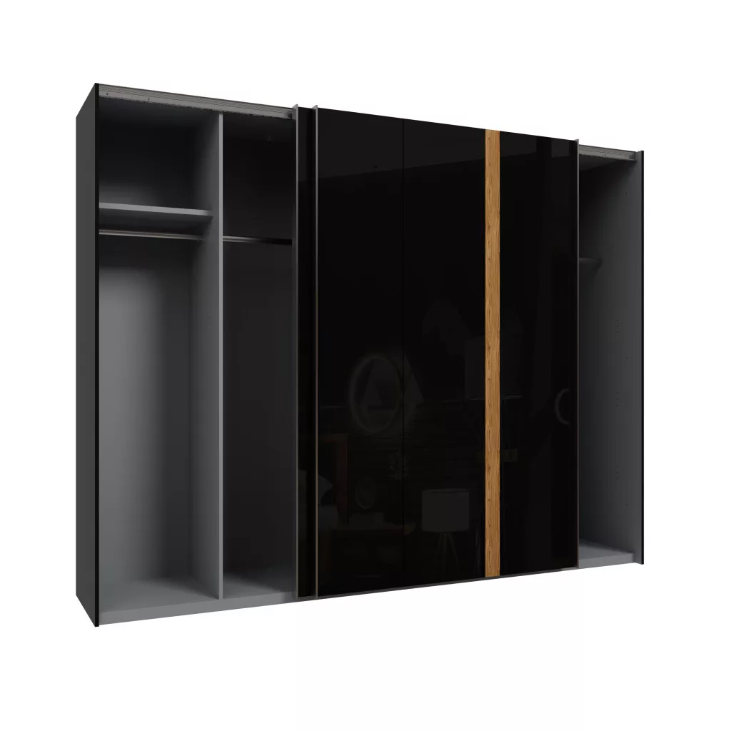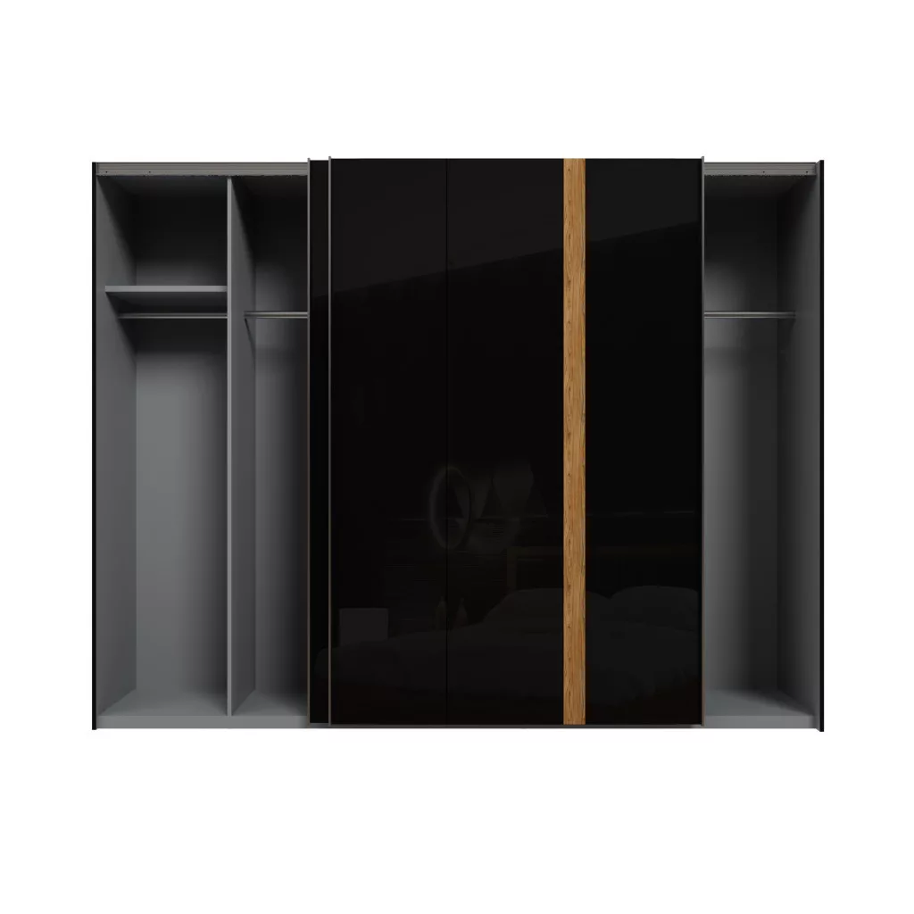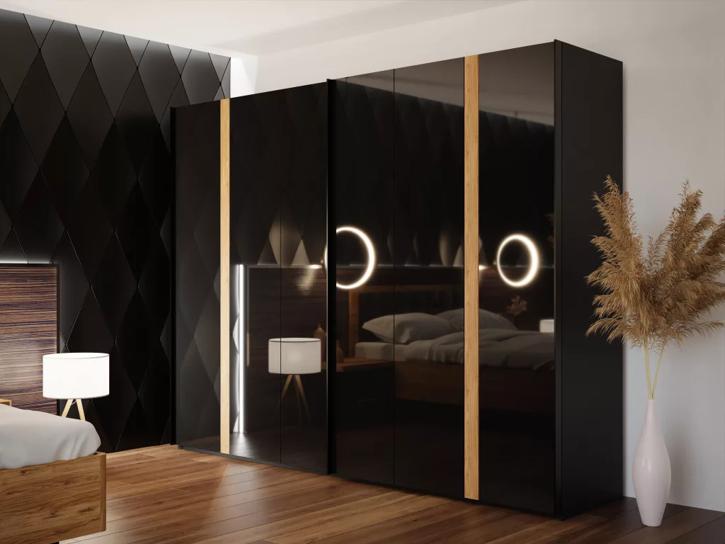 A Tundra tolóajtós gardróbszekrény tökéletes választás azok számára, akik a modern stílust és a funkcionalitást szeretnék ötvözni. Fekete, magasfényű felülete exkluzív megjelenést kölcsönöz a bútornak, míg a natúr fa színű függőleges díszcsíkok karaktert adnak a letisztult designnak.