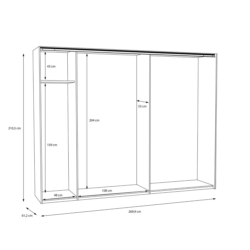 A tolóajtós kialakításnak köszönhetően helytakarékos megoldás, így kisebb hálószobákban is kényelmesen használható. Belső elrendezése praktikus – akasztós és polcos részekkel – így ideális mindennapi ruhatárolásra, rendszerezésre.