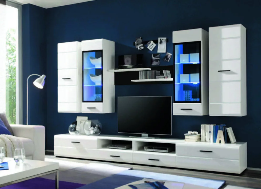 A VUSHER bútorcsalád a modern bútorok képviselője; sonoma tölgy vagy fehér színben kapható, dizájnos formákkal. A TV-szekrény jobb oldalán lenyíló ajtós tárolórész, bal oldalán nyitott polcos tároló és fiók található. Kapható jobbos és balos állású verzióban is.